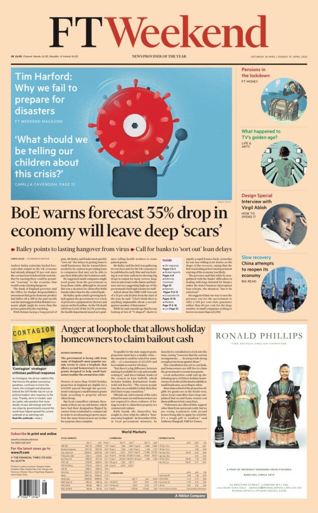 Today’s FT leads with Andrew Bailey’s corroboration of the OBR’s forecast that the UK’s GDP will decline by 35% in Q2 compared to the start of the year. “I don’t think there is anything implausible about a second quarter number of that nature,” he said yesterday. But the Governor of the Bank of England was even more pessimistic than the OBR, questioning whether the economy would return to its pre-lockdown output by the end of the year. The BoE is planning to publish its own forecast in early May and is looking at real-time indicators showing big falls in output for many sectors, soaring universal credit claims and higher-than-expected use of the Government’s furlough scheme in the private sector.