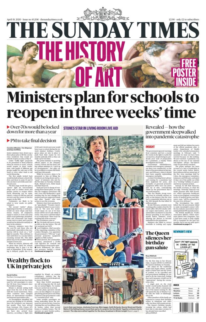 Today’s Sunday Times leads with the story that senior ministers have drawn up a three-phase exit plan that would see schools reopened on May 11th. (If you can’t get past the Sunday Times‘s paywall, you can read about the plan in the Mail here.) Under the “traffic light” plan, which has yet to be approved by Boris, schools would reopen on May 11th during the “green” phase, along with clothes shops, garden centres and hairdressers, and rail and bus services would return to normal. This would be followed by a second “amber” stage, starting in late May or early June, which would see more shops and businesses reopen, all employees urged to return to work and some small social gatherings permitted. Pubs and restaurants and larger events such as sport and concerts would be phased in later in the summer. However, the over-70s and those with underlying health conditions will be stuck on a “red” light and have to wait until a vaccine is available before they’re allowed to resume normal life. (Note to Boris: a vaccine probably won’t be available for several years, so why not just let older people decide for themselves whether to leave their homes and see their grandchildren?)