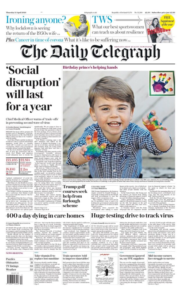 The Telegraph leads on Chris Whitty’s depressing announcement at yesterday the Downing Street press conference that social distancing measures will have to remain in place until a vaccine or “highly effective drugs” are available to avoid a second wave of infections, which could mean well into next year. This bombshell came just moments after Dominic Raab had said there was now a “glimmer of hope”. He didn’t spell out what he was referring to – and he used the same phrase almost two weeks ago, so the glimmer hasn’t got any brighter. But in his speech he referred to “the peak of this virus” three times and implied we’re in the midst of that right now. The Government’s position is that no social distancing restrictions can be lifted until we’re past the peak and there is no risk of a second wave that will necessitate reimposing those restrictions.