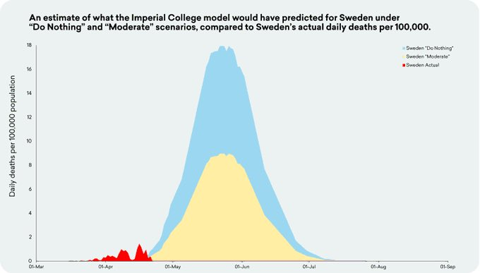 And here’s my favourite graph so far. If you take the assumptions that Professor Neil Ferguson and his team at Imperial College used to predict the death tolls in the UK absent a lockdown (510,000 if we carried on as normal, 250,000 if we continued with mitigation) and use them to model what should have happened in Sweden absent a lockdown, you get the following: