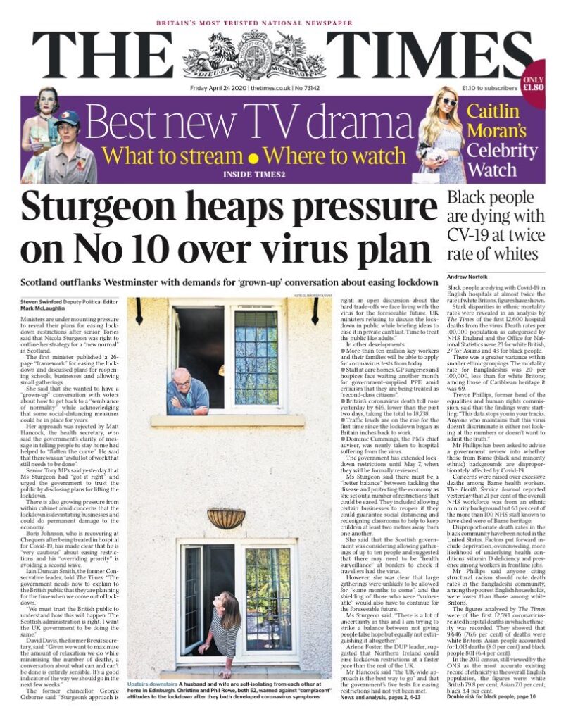 The Times leads with Nicola Sturgeon’s exit plan for Scotland. “The First Minister published a 26-page ‘framework’ for easing the lockdown and discussed plans for reopening schools, businesses and allowing small gatherings,” it reports. Sturgeon didn’t say when this might happen, but argued there should be a “better balance” between tackling the disease and protecting the economy. In addition, Arlene Foster, the First Minister of Northern Ireland, suggested that lockdown restrictions could be eased at a faster pace there than in the rest of the UK. Guernsey has already put an exit strategy in place, with gardeners, mechanics, estate agents and builders returning to work tomorrow. And in an encouraging sign, various senior Tories praised Sturgeon’s initiative, including Iain Duncan Smith, David Davis and former Chancellor George Osborne who said we need to start talking about “the hard trade-offs”.