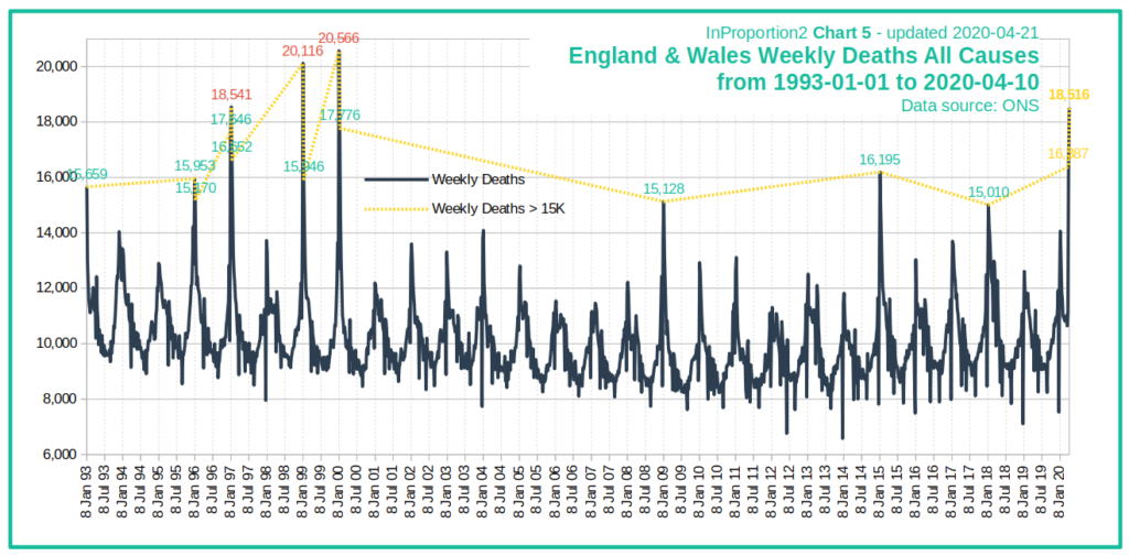 One sceptical website I’ve neglected to mention until now – and should have flagged up earlier – is COVID-19 In Proportion. It’s full of great graphs such as the one below showing that the the number of deaths in Week 15 of 2020 were lower than they were in some previous flu seasons: