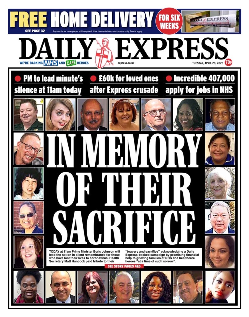 The Express leads with the minute’s silence for NHS workers who’ve died of COVID-19 that was observed at 11am this morning and the fact that the families of front line NHS and social care staff in England who’ve died will receive £60,000 in compensation, which was announced by Matt Hancock at the Downing Street press briefing yesterday.