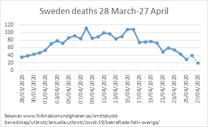 That strategy certainly seems to be working in Sweden, as the New York Times reported yesterday. Sweden’s death rate of 22 per 100,000 is about the same as Ireland’s and far better than in Britain or France. And the graph showing the daily death tolls up to April 27th shows the Swedes have flattened the curve: