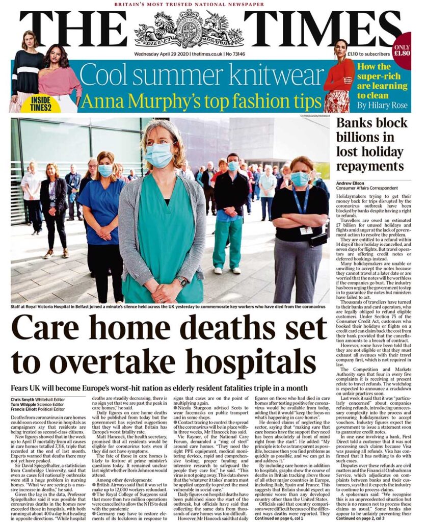 I suspect the scandal here of sending untested elderly back to care homes to deal with when untested for Covid to free up hospital space would be front page news but for the broader picture.