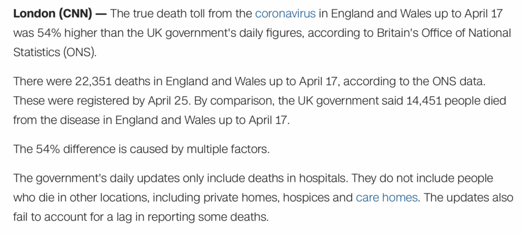 Okay, now for some light relief. Following the publication of yesterday’s ONS data, CNN ran a story headlined: ‘Coronavirus death toll 54% higher in England and Wales than daily stats showed.’ To get this 54% figure, CNN’s Simon Cullen and Zamira Rahim compared the ONS data for the number of deaths registered in England and Wales in the week ending April 17th (22,351) with the number of people the Government said had died of COVID-19 in England and Wales up to April 17th (14,451). “The 54% difference is caused by multiple factors,” the reporters solemnly intoned, and went on to list some of them: the Government’s figures only include people who’ve died in hospitals, not care homes, and the official figures “fail to account for a lag in reporting some deaths”. But there’s a simpler explanation. The ONS figure (22,351) relates to all-cause mortality in Week 16 (April 11th – 17th), while the Government figure (14,451) refers to the number of people who’ve died from COVID-19 in the year to date. Talk about comparing apples and oranges! I’ve posted a screen grab below as, hopefully, CNN will eventually get round to correcting this schoolboy error.