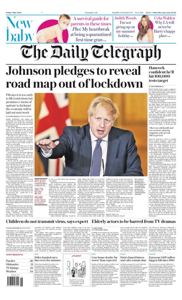 The Telegraph leads with Boris’s announcement at yesterday’s Downing Street press briefing that we are now “past the peak” and he will set out a “road map” next week on restarting the economy and reopening schools. (Robert Peston has more details.) In his first briefing since his return to work, the Prime Minister said the UK was “on the downward slope”, but emphasised the country must not “risk a second spike”. Further on in the same story the paper reveals that some ministers want to wait until the daily number of new infections falls into the hundreds before easing restrictions “after seeing Germany’s infection rate rise when it eased its own lockdown”. In fact, the infection rate hasn’t gone up in Germany since it eased its lockdown last week. On Monday it ticked up to just under 1, but it has since declined and using a one-day rise to claim easing has triggered a second wave of infections is misleading, to put it mildly. The latest R0 number in Germany is 0.76 according to the Robert Koch Institute.