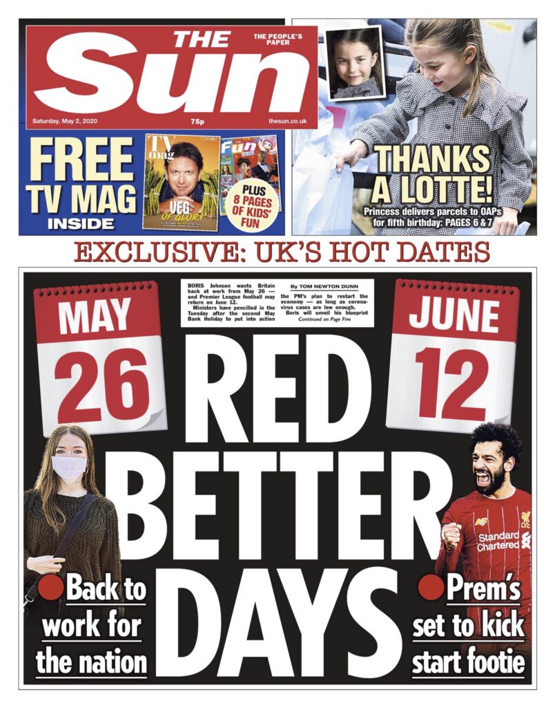 The Sun leads with two important dates: the date we’ll return to work (May 26th) and the date the Premier League will resume behind closed doors (June 12th). May 26th is the day after a Monday bank holiday and according to the Sun‘s Political Editor Tom Newton Dunn the date Boris is going to name as back-to-work day next Thursday. That makes sense because May 7th is the day the Government and its scientific advisors are reviewing the lockdown. According to Newton Dunn, the announcement will give offices, shops and some factories two-and-a-half weeks to install new government social distancing measures, such as perspex screens and gaps between desks, as well as give the public enough time to overcome their “coronaphobia”. That’s the Sun‘s word for the fact that two-thirds of the public are now too scared to leave the house, as revealed in a poll for Ipsos Mori.