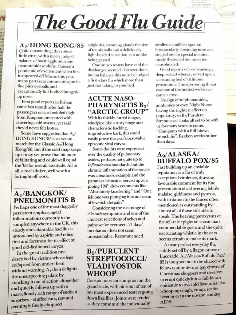 For more light relief, have a read of ‘The Good Flu Guide’, an article published in Punch in 1987 (author unknown). Hat tip to comedian Simon Evans – one of the few right-of-centre comics to appear regularly on Radio 4 – for unearthing this gem: