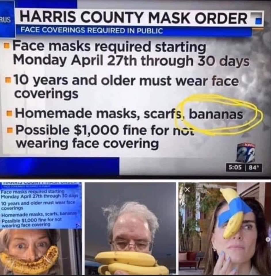 Happily, not everyone around the world has responded so cravenly to being bossed around by the authorities. The residents of Harris County, Texas have been having a laugh at the expense of a recent announcement about what face-coverings they should wear that misspelt “bandana” as “banana”: