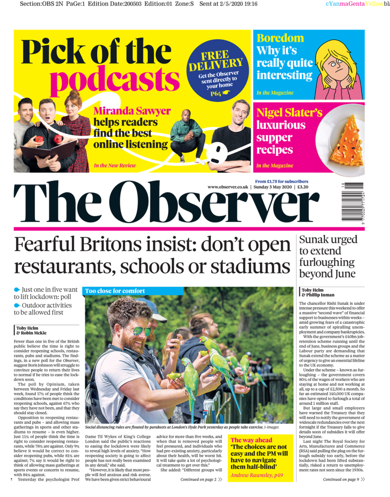 The Observer leads with a new poll by Opinium that reveals fewer than one in five of the British public believe the lockdown should be lifted. 67% of people think schools should remain closed, against only 17% who think they should reopen. Just 11% think it’s time to reconsider reopening restaurants, with 78% against, while only 9% think pubs should reopen, with 81% against. When it comes to sporting events, 84% are against allowing mass gatherings to take place, with just 7% in favour.
