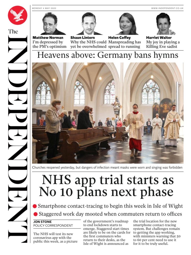 The Independent leads with the news that the NHS is about to pilot its new coronavirus detector app – known as the “NHSX app” – in the Isle of Wight. Matt Hancock is expected to announce at today’s Downing Street press briefing that the 141,000 residents of the island will become the first people in the country to test the new homegrown app.