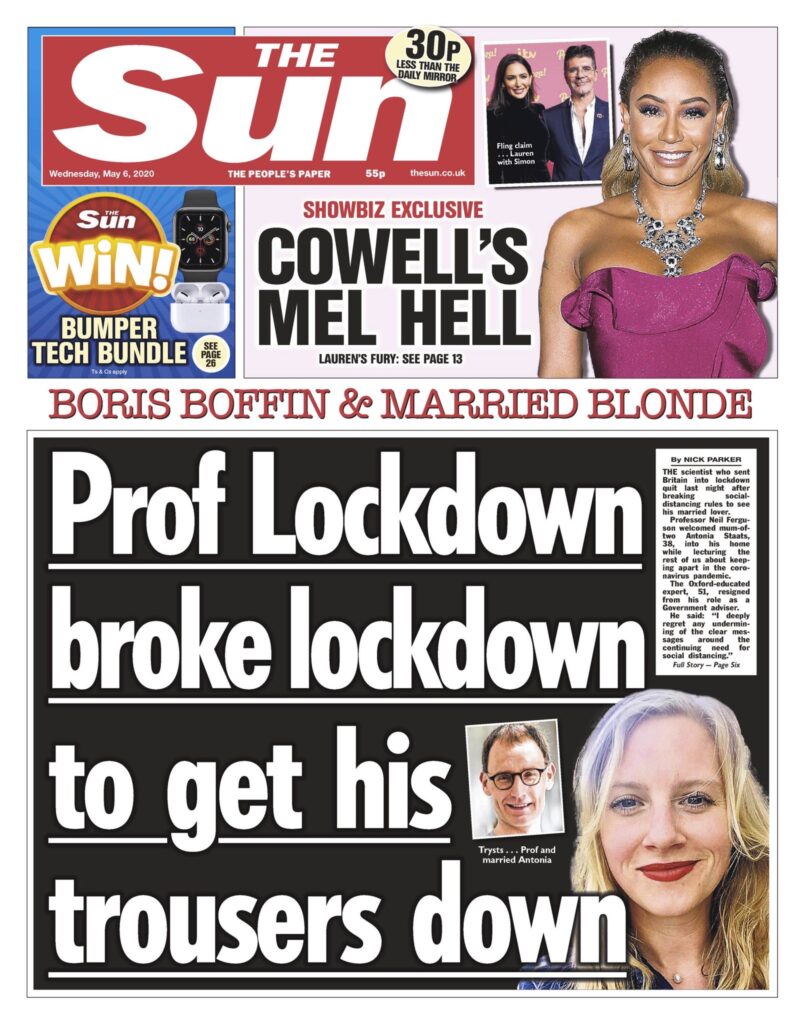 No prizes for guessing what story dominated this morning’s papers: Professor Pantsdown. A couple of weeks ago I dubbed Neil Ferguson “Dr Strangelove”, trying to capture the mesmeric effect he seems to have had on successive British Prime Ministers. But it turns out the “Strange Love Doctor” would have been more appropriate. According to the Telegraph‘s spellbinding scoop – a marmalade-dropper if ever there was one – Ferguson has been carrying on an affair with a married mother-of-two during the lockdown. Talk about breaking the social distancing rules! And the icing on the cake is that the name of his 38 year-old mistress is Antonia Staats! You couldn’t make it up, as we say on Fleet Street. The punning possibilities are endless. (Guido Fawkes: “Who could blame a boffin for wanting to massage his staats?“) Incidentally, if you can’t get past the Telegraph‘s paywall, not to worry. The story is also in the Mail, the Guardian, the Metro, the Independent, the New York Times… it’s everywhere. The BBC even has it, although in a very muted form. The latest development is that Matt Hancock says it’s now in the hands of the police. Are we about to see Imperial’s Professor of Mathematical Biology led away in handcuffs? The intellectual architect of Britain’s draconian coronavirus policy may be about to experience what it’s really like to be locked down. (He won’t, obviously, but I couldn’t resist that.)