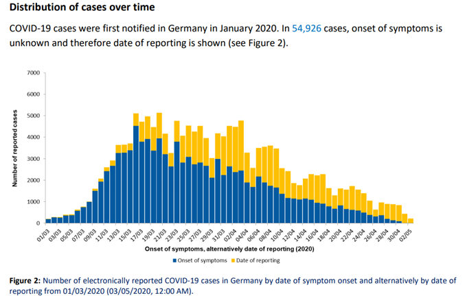 Latest data from Germany’s Robert Koch Institute suggests no “second spike” in infections as a result of the country easing its lockdown. Here’s a graph that illustrates the point nicely: