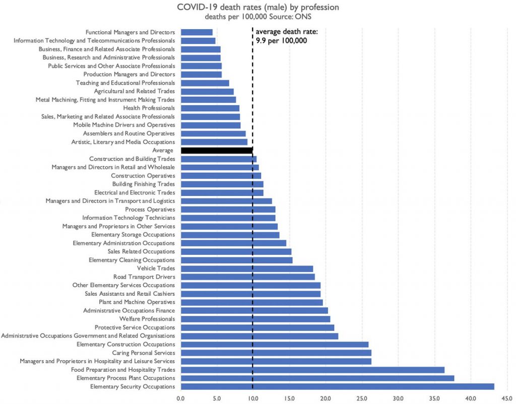 This won’t come as a surprise to readers of Lockdown Sceptics because we’ve already crunched the numbers twice and come to the same conclusion: the ONS has confirmed that NHS workers, listed below as “Health Professionals”, face a lower-than-average risk of dying from COVID-19 than other workers. The BBC ran a story on this, pointing out that the most vulnerable group in the UK are, in fact, security guards.