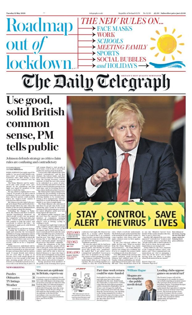 The press is having fun today about the apparent “confusion” in Boris’s exit plan, with some papers flagging up new rules which weren’t included in his speech on Sunday. For instance, he originally said we could play sports from tomorrow, but only with members of our own household. That’s now been amended to one person from another household as well. Matt Lucas did an amusing impression of Boris getting in a bit of a muddle that went viral. (Are we still allowed to use that word?)