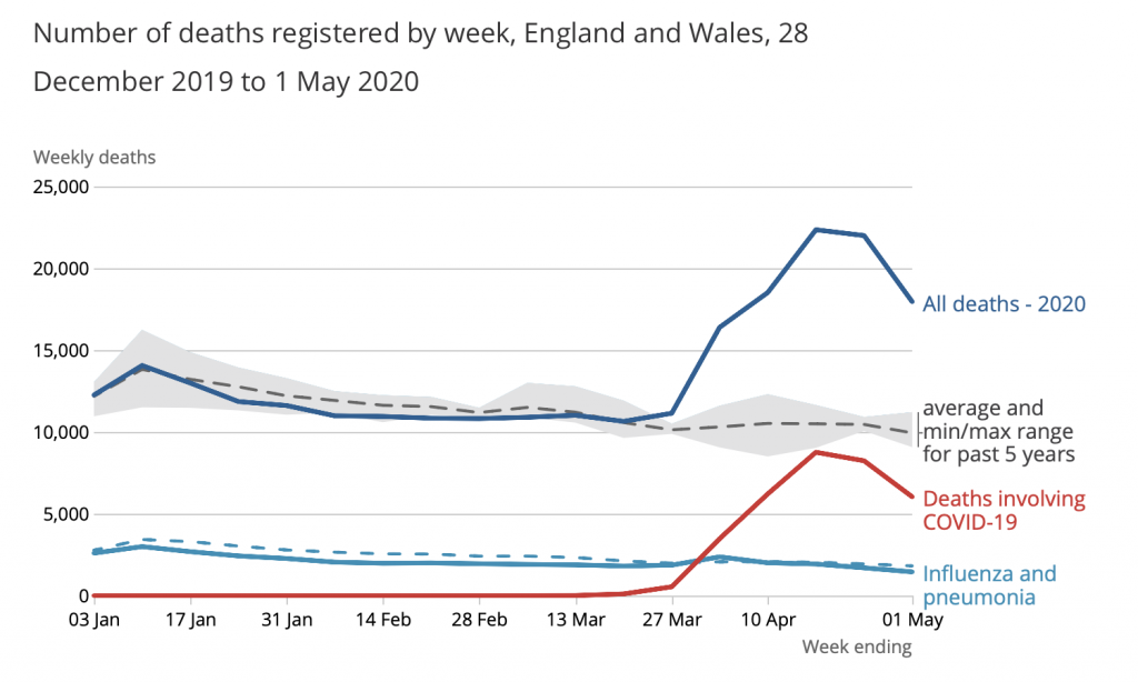 The ONS also released data this morning about registered deaths in England and Wales in Week 18 (April 25th – May 1st). All deaths are down, including those involving COVID-19. You can see the year-to-date trend lines in the ONS graph below: