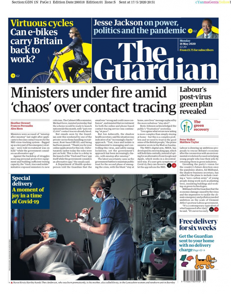 The Guardian leads this morning with the latest woes over the NHS’s contact-tracing app. The message about there being a second version of the app may have got lost in the post on its way to the Ethics Advisory Board (see yesterday’s daily update), but it made it to the Kent-based recruiters tasked with hiring 18,000 trackers and tracers. According to the Guardian, applicants have started to receive the following response: