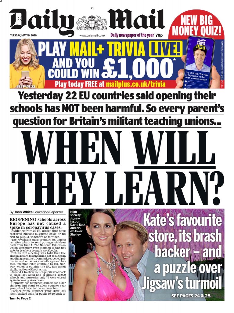 The Mail quotes Alan Smithers, Professor of Education at the University of Buckingham: ‘The unions have been asking for evidence, and this is it. So they should start cooperating fully with the Government so that our schools can open again as soon as possible.”