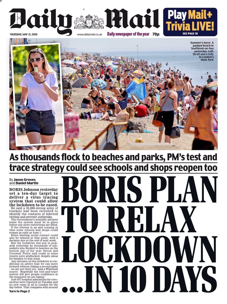All the papers had pictures of people ignoring social distancing rules to enjoy Britain’s hottest day of the year, with temperatures climbing to 82F – although the snappers know their pictures are more likely to be used if they make it look as if people are bunched more closely together than they are. According to the Mail, tens of thousands of sun seekers packed on to beaches up and down the country and traffic wardens ran out of tickets.