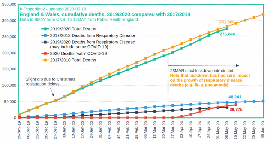 Interesting post on the COVID-19 In Proportion blog pointing out that the total number of deaths in England and Wales between November 29th and May 8th (275,044) was lower than the total number in the same period in 2017-18 (281,566), when there was an above-average number of deaths from seasonal flu. He also notes that the lockdown on March 23rd doesn’t appear to have made any dent in the number of people dying from non-Covid flu and respiratory diseases in 2019-20: “If lockdown is effective at stopping the spread of infection wouldn’t there be a drop in the rate of non-Covid flu and respiratory deaths?”