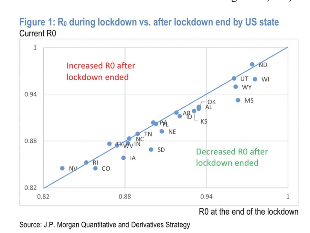 This chart formed part of a presentation by JP Morgan to investors yesterday. It shows infections haven’t increased in those US states that have ended their lockdowns. The JP Morgan analyst told investors: “This means that the pandemic and COVID-19 likely have its own dynamics unrelated to often inconsistent lockdown measures that were being implemented.” NBC’s Carl Quintanilla did a Twitter thread on the presentation yesterday.