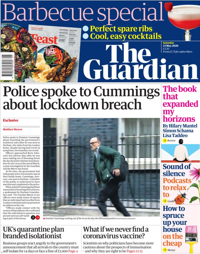 The Guardian has splashed with a humdinger of a story today, revealing that Dominic Cummings drove 264 miles from his home in London to stay with his parents in Durham. The police were tipped-off on March 31st after Cummings was spotted in his parents’ front garden with his three year-old child by a member of the public and officers “explained to the family the guidelines around self-isolation and reiterated the appropriate advice around essential travel”.