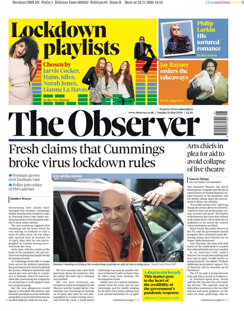 The Observer drops the second shoe in the Cummings scandal on its front page – the news that he visited his parents in Durham again in the middle of April after staying with them at the end of March. How do they know this? Thanks to an eagle-eyed member of the public: