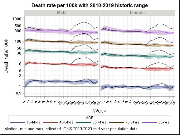 UK weekly mortality rate by age group. There is excess mortality even in the 15-45 group. From 45-85, mortality was doubled. Above 85 it was trebled. Data is to week 20 with a 10 year median/min/max.