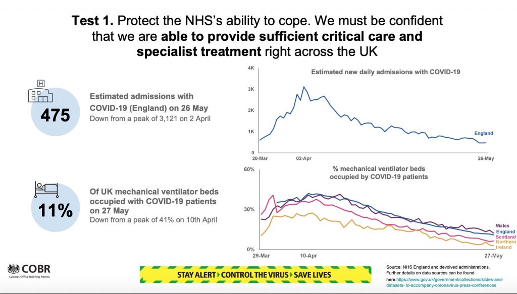 The Cabinet Office Briefing Room issued a chart yesterday (see above) showing that the Government’s first “test” – “We must be confident that we are able to provide sufficient critical care and specialist treatment right across the UK,” in the words of the Prime Minister – has been met. This was part of the rationale for allowing up to six people from different households to meet up from June 1st.