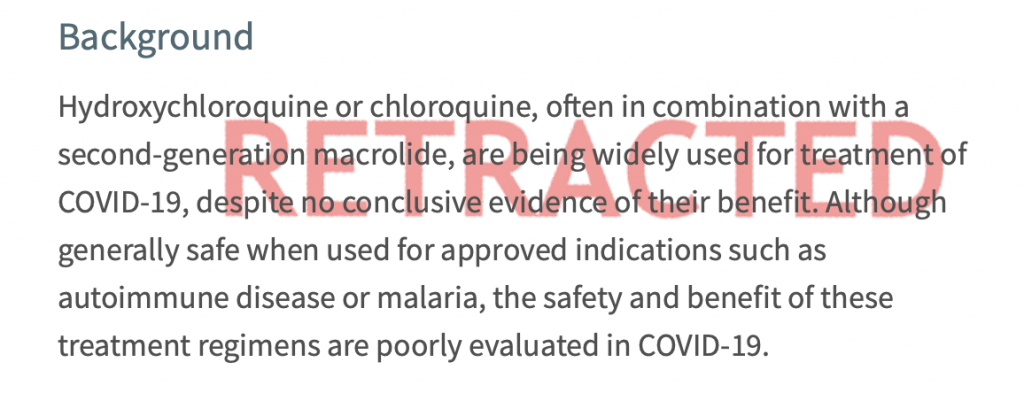 Turns out, the Lancet study was fake news. The data were from a little-known US healthcare analytics company called Surgisphere. According to a report in the Guardian: