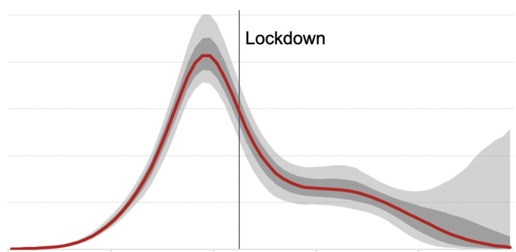 There is no doubt that Ferguson’s model was impactful. It suggested that hundreds of thousands of people would die from COVID-19 if the Government continued to pursue a policy of mitigation. This put containment back on the table and gave legitimacy to more coercive action from Government, but the measures it recommended did not amount to a full lockdown. Its social distancing recommendations were far from trivial and yet they seem modest after nine weeks of genuine lockdown (the authors anticipated most people still going to work, for example). The only time Ferguson and colleagues use the word “lockdown” in the text is when they are making a distinction between their proposals and an actual lockdown. They implicitly dismiss a lockdown as being too extreme for the UK, saying that their favoured policies are “predicted to have the largest impact, short of a complete lockdown which additionally prevents people going to work”.