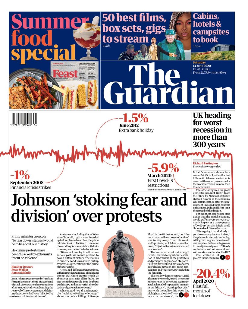 Thought I’d post this Guardian front page, not because of the disgraceful headline about Boris – standing up for the leader who saved the world from fascism does not constitute “stoking fear and division” – but because of the red line showing the fall in Britain’s output in April. The worst recession in 300 years!