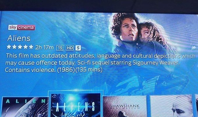 Incidentally, it isn’t just Aliens that now carries a “disclaimer” on Sky. According to the Mail, 16 films have now been put on the naughty step: