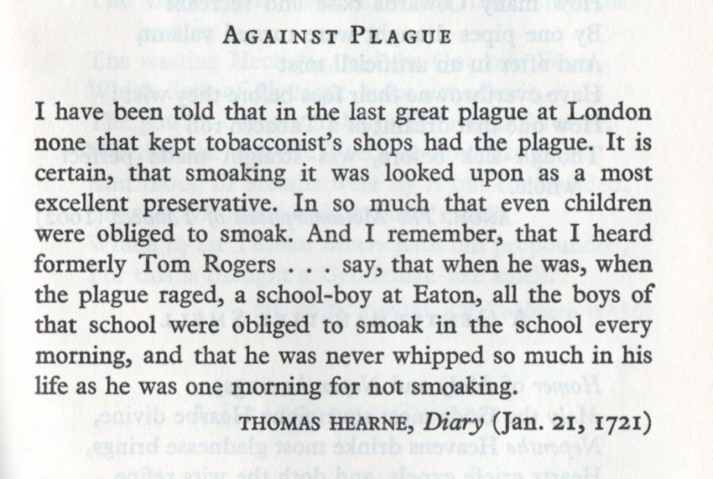 A reader sent me the above extract from Thomas Hearne’s Diary. Looks like it isn’t just Covid that tobacco protects people from…