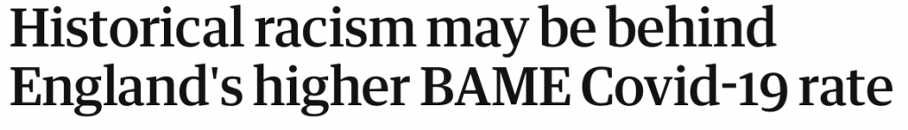 One of my readers, a retired NHS Consultant and member of the BAME population, has written a brief review for me of the delayed Public Health England report on why BAME people appear to be more vulnerable to COVID-19 than white people. This report was much ballyhooed when it was published a few days ago, with its conclusions seeming to chime with the claims of the Black Lives Matter protestors. It led to hysterical headlines, such as this one in the Guardian: “Historical racism may be behind England’s higher BAME Covid-19 rate“.