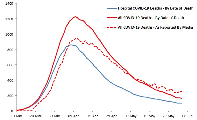 It is peculiar and disappointing that around the start of June the Government stopped releasing the number of daily COVID-19 deaths in hospitals. If that is now approaching a few tens per day, we can assume (by extrapolation) the same is true for daily COVID-19 deaths in care homes.