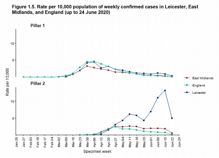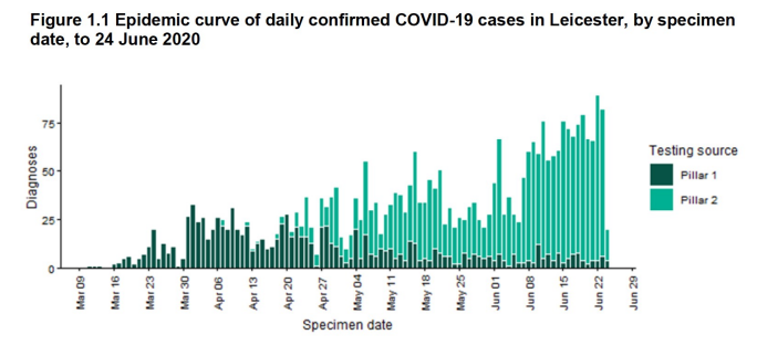 The point of “Lockdown” has always been to ‘flatten the curve’ in order to ‘Protect the NHS’. Given we were coping on March 31st, when we had nearly ten times the number of positive cases in hospitals, with relatively little access to testing, we are certainly coping now. The issue and alleged cause of the “Local Lockdown” is our Pillar 2 numbers, which are the lighter green ones on the graph. These are the community tests outsourced to private companies. There is no guarantee that these tests are all taken from different people (unlike the Pillar 1 data, which is cross checked against a unique patient identifier). In fact, the Government accepts that the number of Pillar 2 cases is not the same as the number of people with COVID-19 because Pillar 2 data includes people who’ve been tested more than once – often because they have to re-test before they’re allowed back to work.