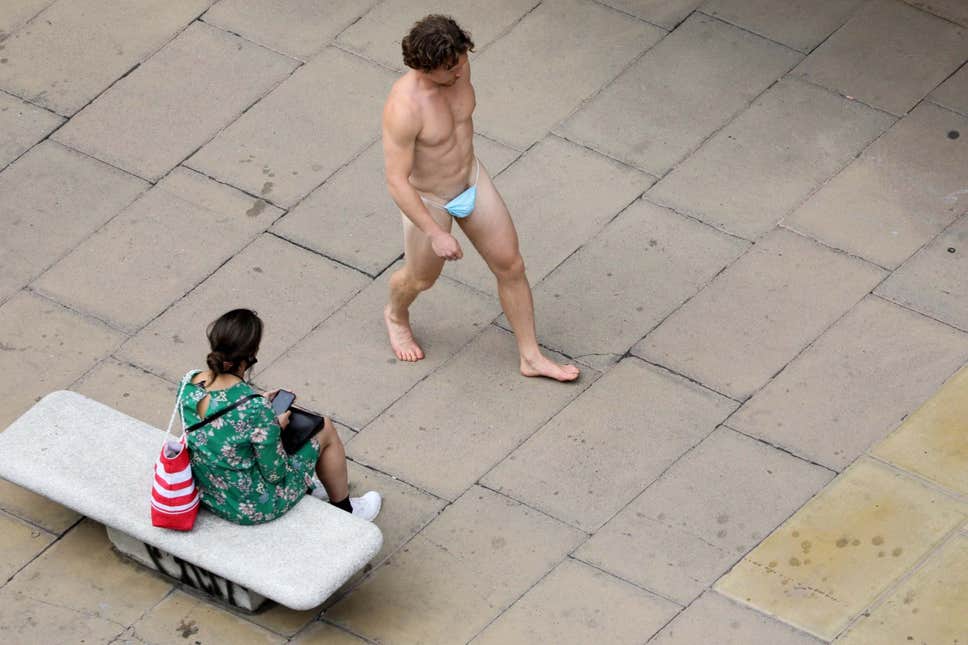 This brave soul walked down Oxford St yesterday wearing a face mask – and nothing else! The Evening Standard, which has several photographs of the gentleman, does not disclose whether he was allowed into H&M or Top Shop.