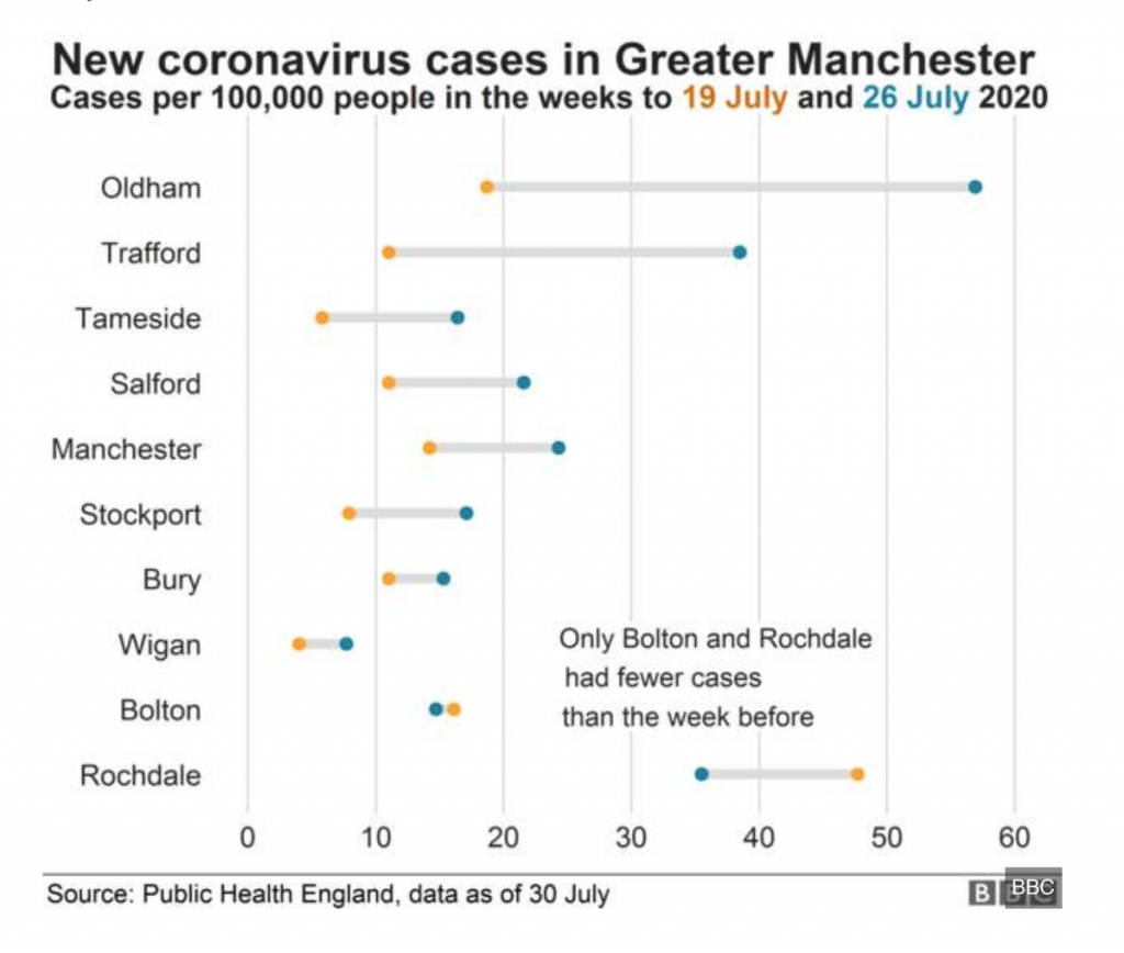 The BBC also published some data from PHE showing the number of new cases per 100,000 has increased in some parts of Greater Manchester, although it has fallen in Bolton and Rochdale: