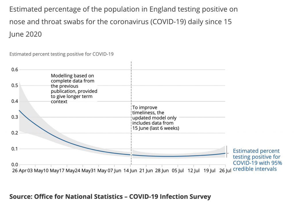 The figures are based on its infection survey, which takes swabs from people selected at random in homes in England.