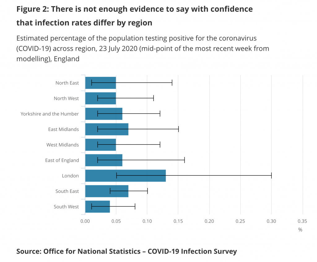 Can these data be used to justify the new measures? No. The ONS has produced a breakdown of the percentage of infected people per region, but it shows that the North West has fewer infected people than all but one other area (the South West) and lower than Yorkshire and the Humber, the East Midlands, the East of England, the South East and London, which is way out in front. If I lived in Manchester, I would ask why I’m having to endure these additional restrictions when a smaller percentage of my city is infected than London.