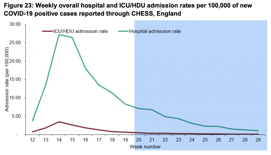 It also published data showing the number of people testing positive for COVID-19 being admitted to hospital and ICUs has declined since early April and is continuing to fall: