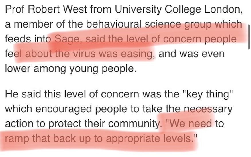 A reader sent me this extraordinary comment made by Professor Robert West from University College London, a member of the behavioural science group that feeds into SAGE, on the Today programme. You really couldn’t make it up.
