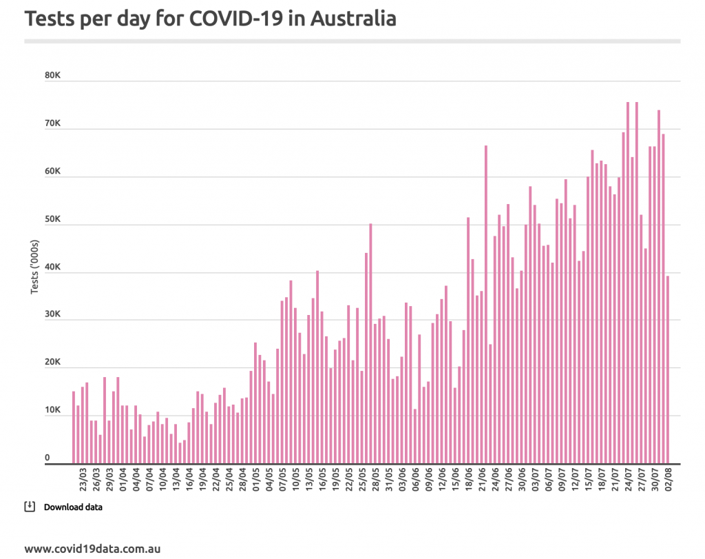 Victoria tested almost 43,000 on Sunday, July 26th, twice as many as on normal days, and the peak on Wednesday could be due to the few days delay before the results come through. In addition, a percentage of the positive results are likely due to the extensive contact tracing introduced in the past few weeks, with targeted testing of those who’ve been in contact with other infected people.