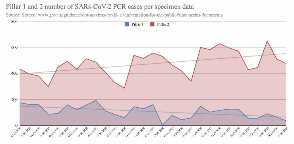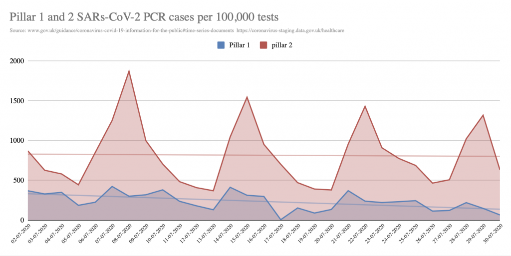 However, what happens if you adjust for any change in testing over time? On July 1st – the seven day moving average of testing was 41,109 for Pillar 1 and 43,161 in Pillar 2. By July 31st, the Pillar, 1 seven day average for testing had increased to 49,543 (a 20% increase); while the Pillar 2 had risen by much more – by 82% to 78,522 tests.