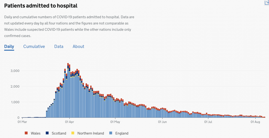 Yesterday, 1,062 people tested positive for COVID-19, up from 758 cases in the previous 24 hours. Anything to worry about? No. According to yesterday’s Sunday Times, the number of people in hospital with Covid-19 has fallen by 94% since the peak of the pandemic. Hospital staff are treating about 1,067 coronavirus patients a day in England, compared with about 17,000 a day in the middle of April, says NHS England. The Times has more.
