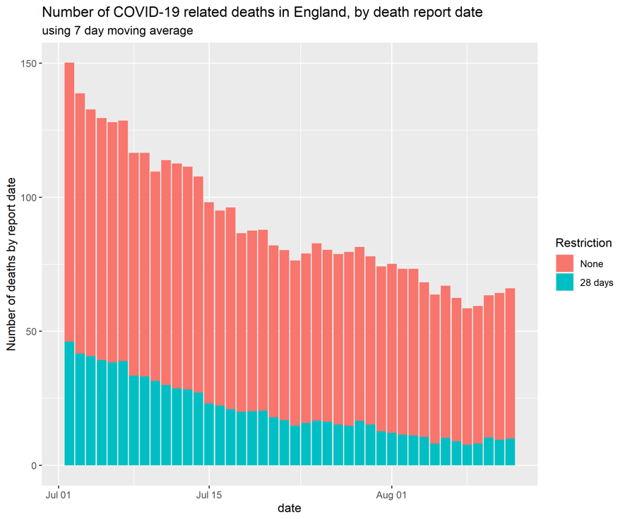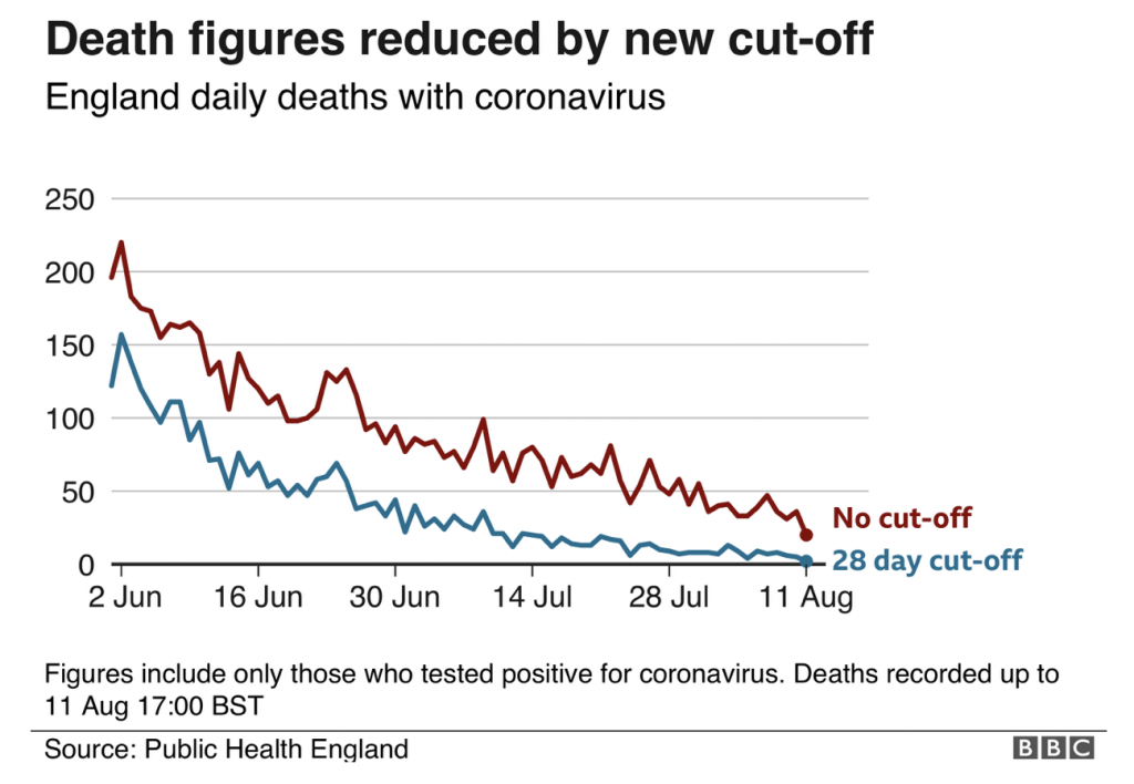 under the old PHE system, 2,086 deaths were reported in England in July by date of death, with the 28 days cut off this number is 574 â nearly a quarter of what was previously reported.