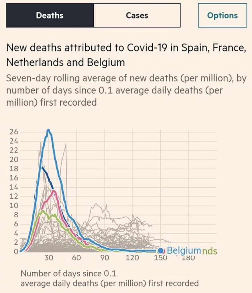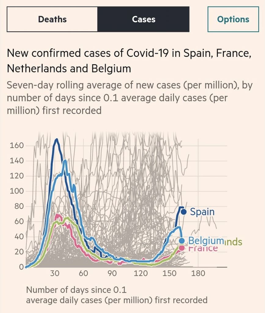 We often hear alarmist reports of a ‘second wave’ in Europe, with rumours swirling about which countries are about to be removed from the travel corridor. According to the Telegraph, as many as 14 countries could soon be removed from the list, including the Netherlands, Gibraltar, Monaco, Malta and San Marino. But in the case of every ‘second wave’ country, all we’ve seen is an uptick in the number of people testing positive each day, no corresponding uptick in the number of daily deaths. I’m grateful to the FT for helping to make this point with a couple of graphs.