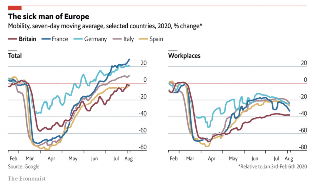 The above graphs from the Economist show that the British are more frightened to leave their homes than the citizens of France, Germany, Italy or Spain, particularly when it comes to returning to the workplace. Not the sick man of Europe, exactly, since the UK’s Covid deaths per million are in line with those of France, Italy and Spain. Rather, the hypochondriac of Europe.